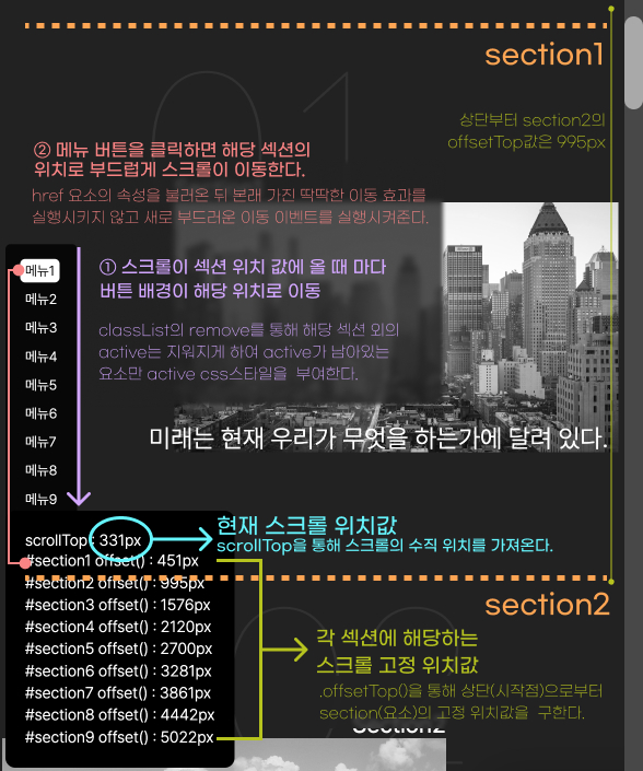 //์ ํ์ offset์๊ฒ section์ n๋ฒ์งธ offsetTop๊ฐ์ innerText๋ฅผ ํตํด ์ ์ฅ์ํจ๋ค.